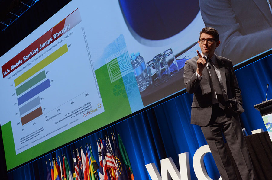 Wetherington, el orador principal en la sesión del lunes, compartió un pronóstico y el resumen de las mejores investigaciones del sector en relación con los próximos acontecimientos en los servicios en línea, móviles, pagos y sucursales. Wetherington ofreció sugerencias sobre la oportunidad única del movimiento cooperativo mundial de utilizar los datos de sus socios—a los que ninguna otra institución tiene acceso—para entender y satisfacer las necesidades de asesoría financiera de sus socios a través de los pagos móviles y en línea.